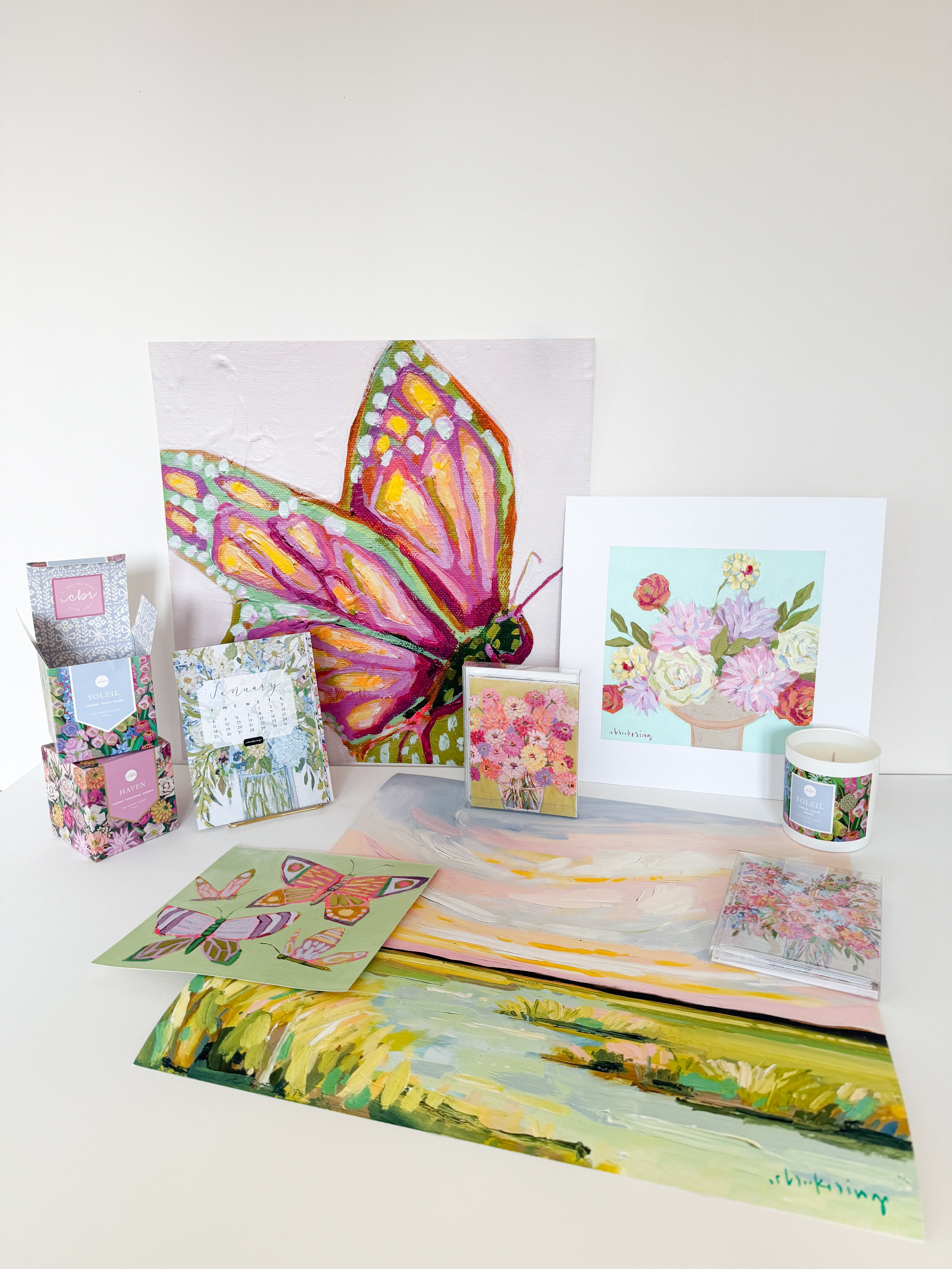 At the heart of the bundle is Flowers for Emily, an original 8×8" painting filled with warmth and movement, paired with a thoughtful mix of fine art prints that speak to togetherness, reassurance, and quiet joy. Surrounding the artwork are everyday pieces designed to be used and enjoyed—paper goods for handwritten notes and candles that bring comfort into the home.